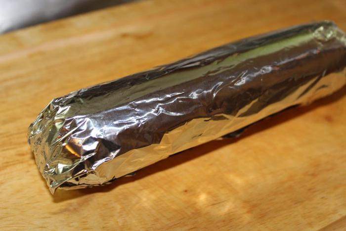 Аккуратно свернуть в виде колбаски, завернуть крепко края