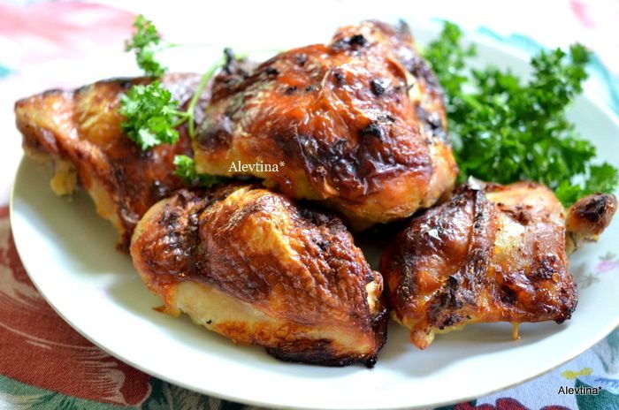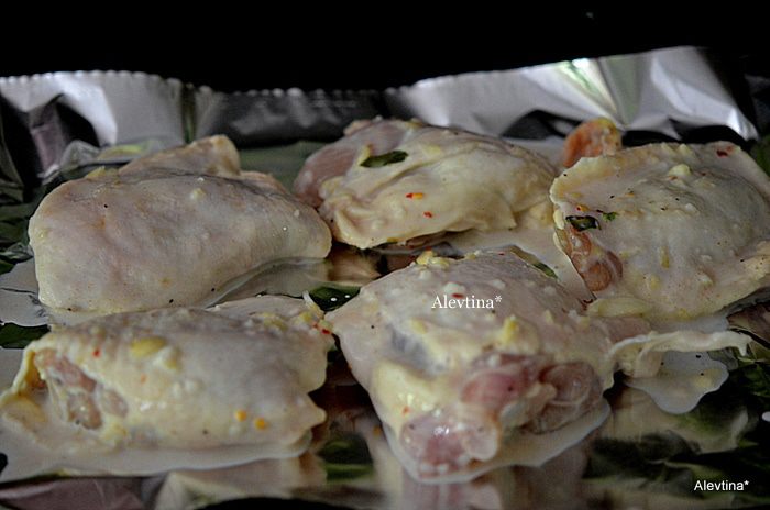 Выкладываем с маринада куриные бедрышки на противень с фольгой. Ставим в разогретую духовку на 200 гр на 50 мин.или до готовности.