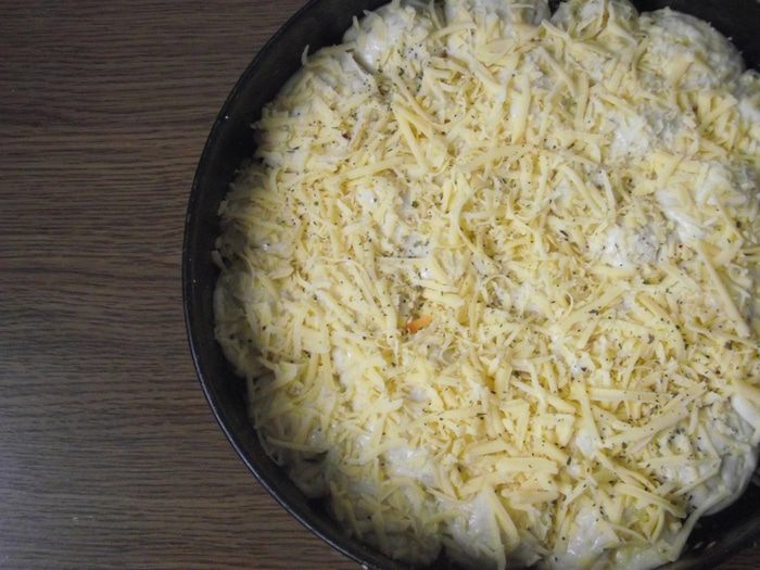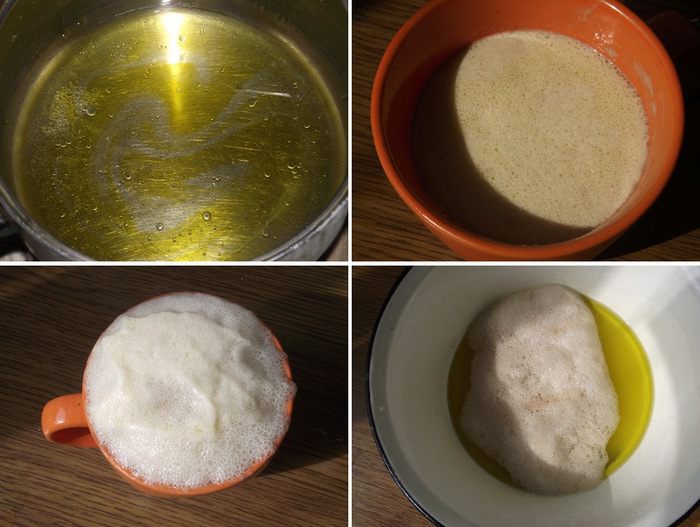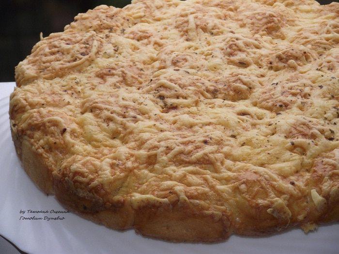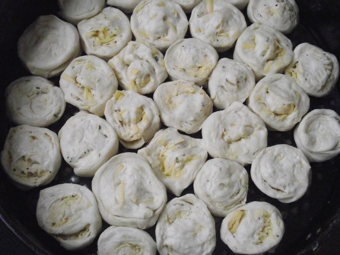 Просеять половину муки и замесить тесто, продолжая добавлять порциями оставшуюся часть муки. Для легкого замеса смазать руки оливковым маслом. Тесто замешиваем интенсивно, растягивая его и складывая в несколько слоев. Вмешиваем в тесто небольшими кусочками сливочное масло. Тесто должно получиться гладким, мягким и однородным. Смазать миску оливковым маслом и отправить в нее тесто, укутав пакетом. Тесто должно увеличиться в объеме в 2 раза.