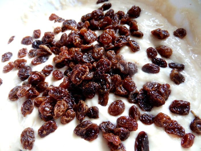 Изюм перебираем,промываем,просушиваем на салфетке и отправляем в поднявшееся тесто.