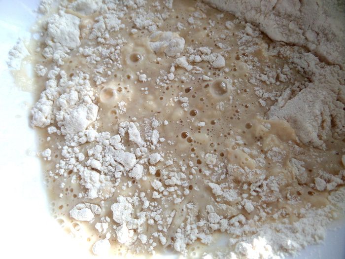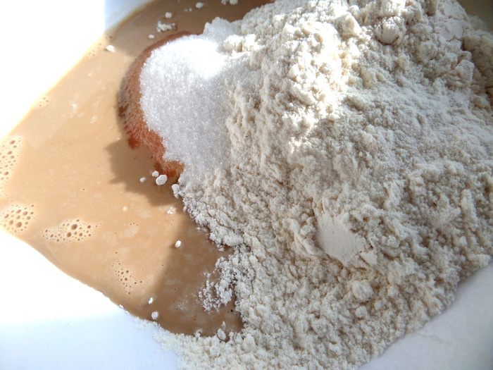 Нагреть сыворотку в микроволновке 1 минуту,развести в ней дрожжи,сахар,соль,добавить муку.
