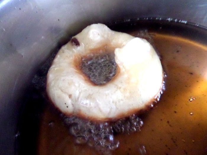 Окунаем ложку с тестом обратно в масло,держим минуту и,слегка приподнимая ножом,откидываем пончик с ложки в масло. возвращаемся к тесту и делаем следующую порцию.