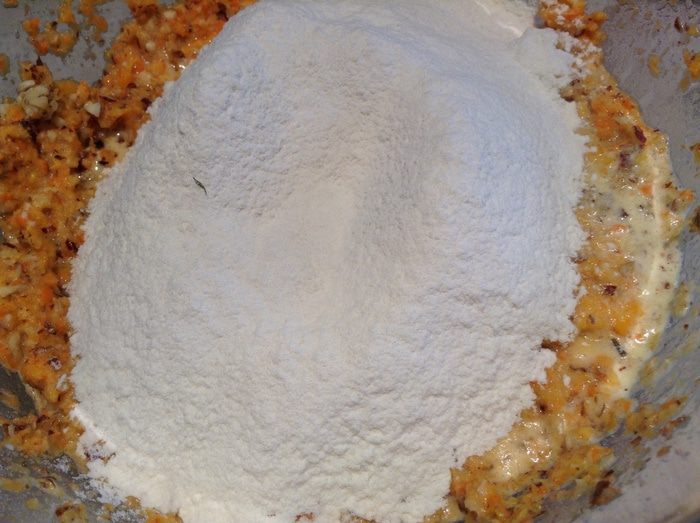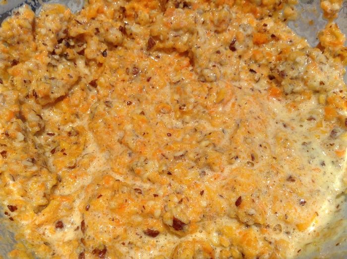 Добавить к желткам орехи, тыкву и морковь.