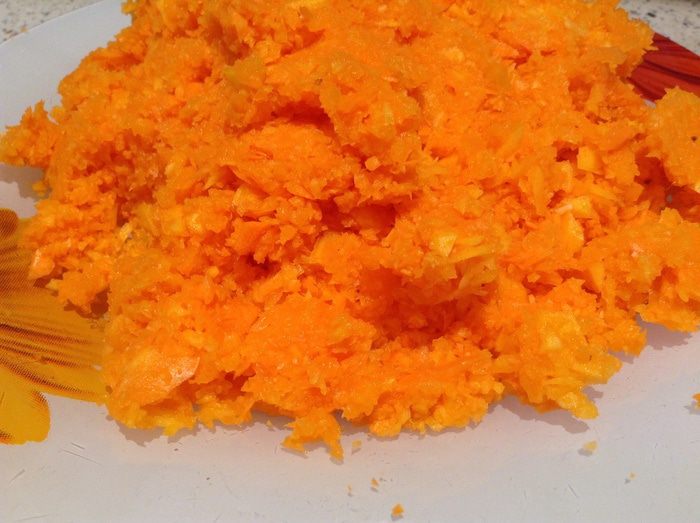 Морковь и тыкву измельчить в блендере или натереть на мелкой терке.
