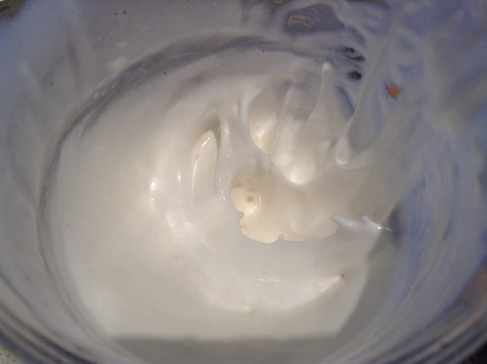 В отдельной емкости взбить белки с щепоткой соли, постепенно добавить сахаренную пудру.