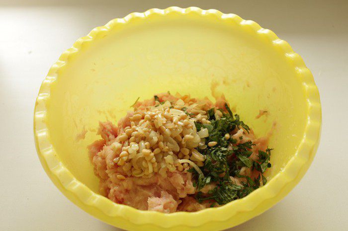 К фаршу добавить базилик, обжаренный лук с орешками, щепотку соли и чёрного молотого перца.