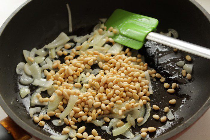 Затем добавить орешки и жарить всё вместе ещё 2-3 минуты.