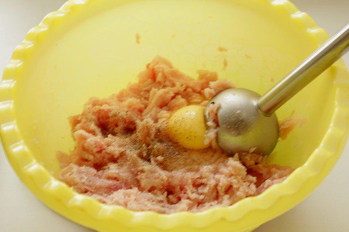 На мясорубке перекрутить куриное филе с багетом размоченным в молоке(я сделала это блендером), добавить яйцо.
