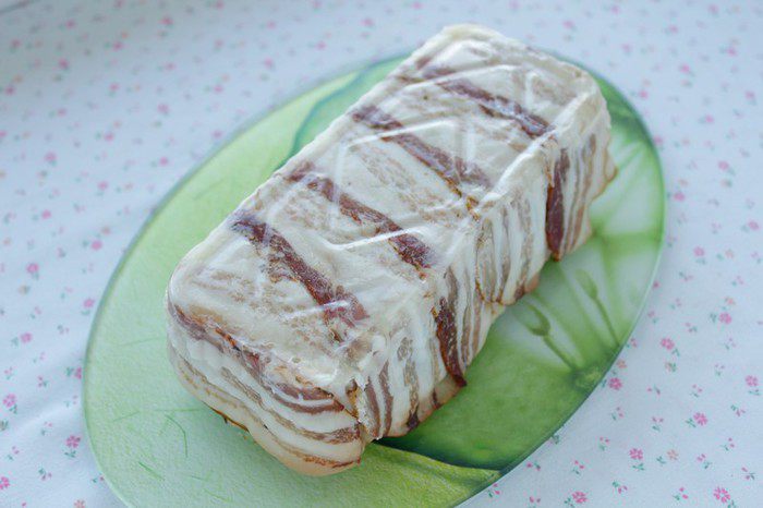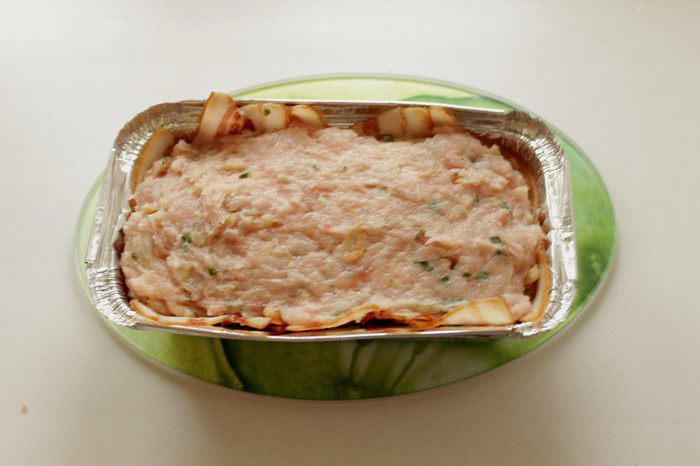 Выложить форму беконом, затем выложить фарш, сверху снова бекон. Выпекать в разогретой до 180 °С духовке 45-50 минут.