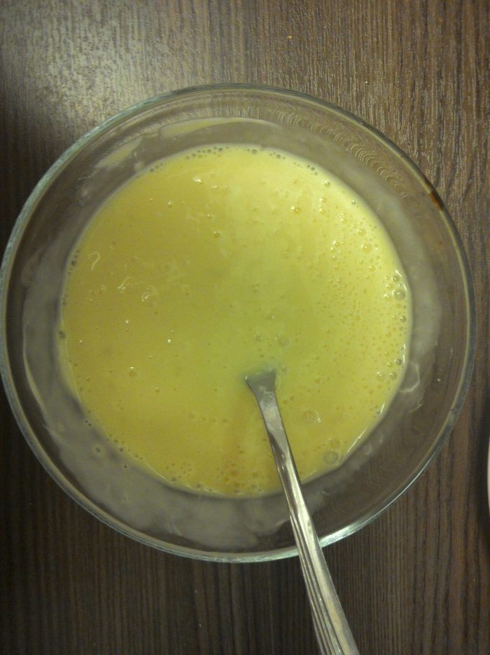 Вилкой смешать яйцо с ложкой майонеза, вылить на разогретую сковороду.