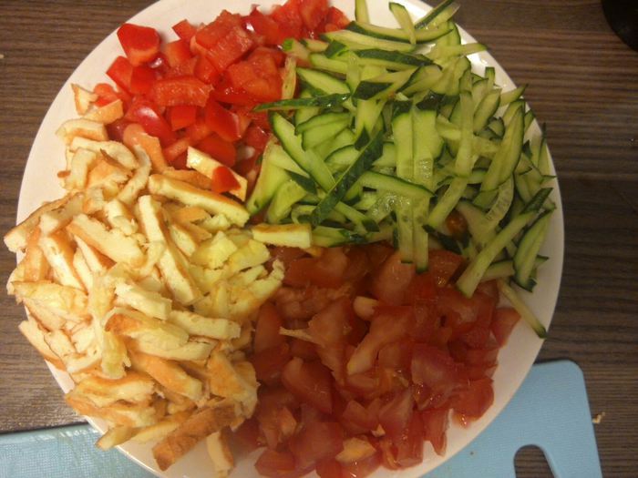 Нарезать помидоры, перец, огурец и омлет на кубики или соломку.