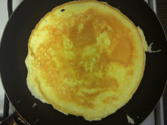 Обжарить с двух сторон, получится тонкий, плотный омлет.