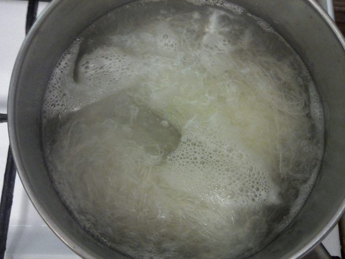 Фунчозу положить в кипящую воду и варить в течении 1 минуты. После откинуть на дуршлаг и промыть холодной водой.