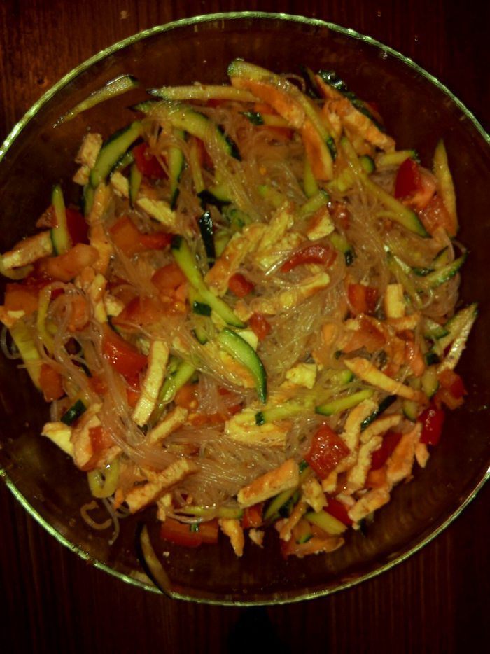 Смешать овощи с лапшой. Полить салат заправкой и соевым соусом.