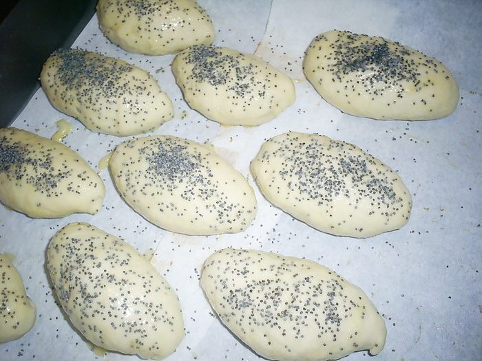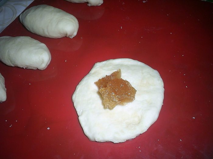 Каждый кусочек я просто руками расплющиваю в лепешку, кладу начинку, формирую пирожок и кладу на противень с пергаментом, швом вниз.