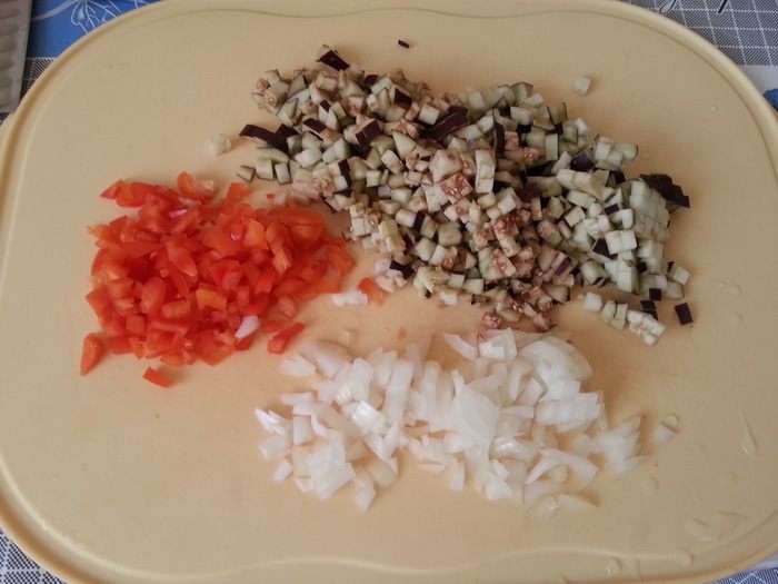 На небольшом количестве растительного масла обжариваем сначала лук, добавляем мясо, затем перец и баклажан. Затем помидор и чеснок, солим и перчим по вкусу. Начинку выкладываем в патиссоны и накрываем крышкой...