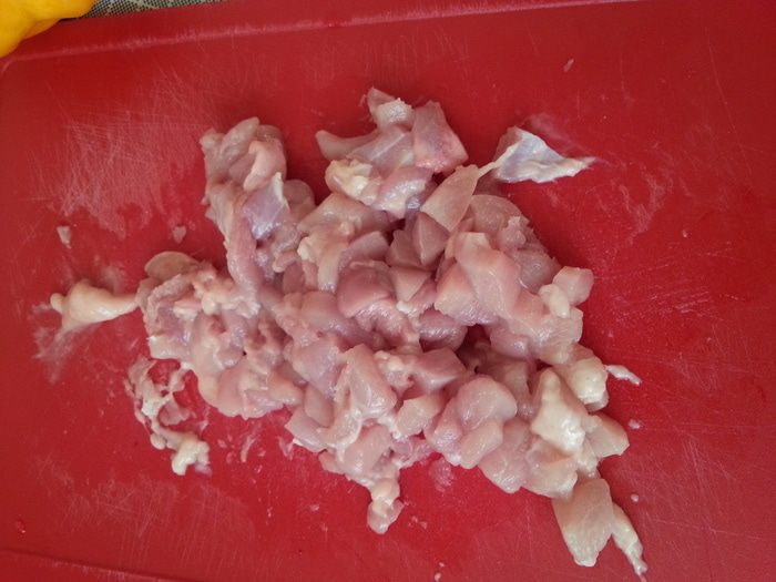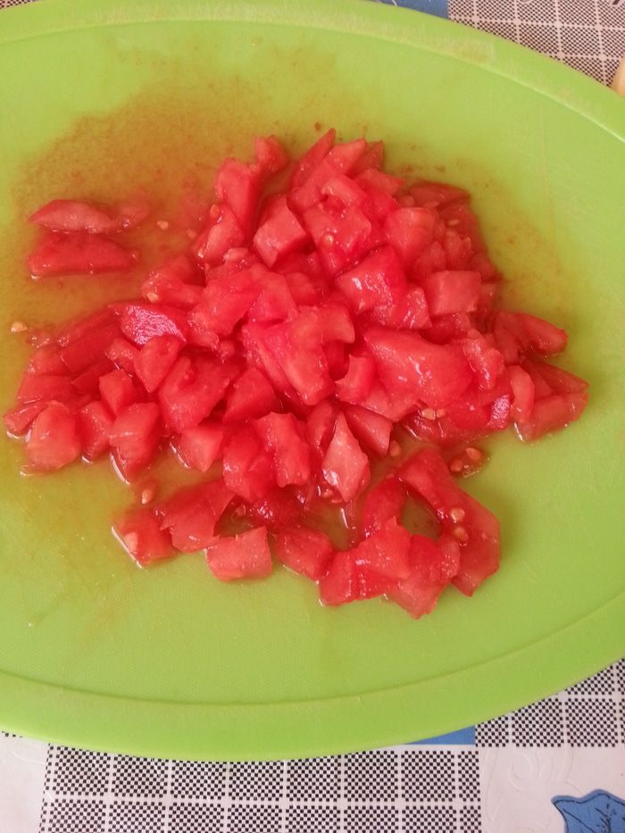 Помидор надрезаем и ошпариваем, убираем шкурку и мелко режем...