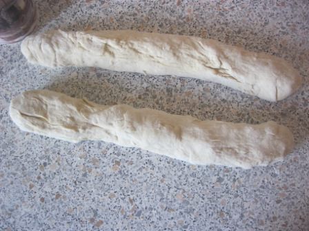 Аккуратно переложить батон на противень, застеленный п.бумагой.