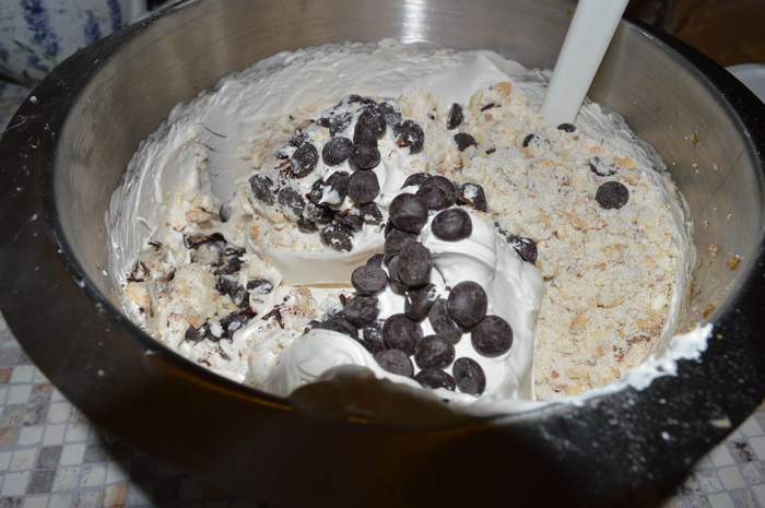 Вводим в яичную пену маскарпоне , сливки - их можно отдельно немного взбить, если боитесь работать с жидким кремом- по рецепту отдельно взбивать не нужно, крем достаточно жидкий- шикарно потом застывает.
