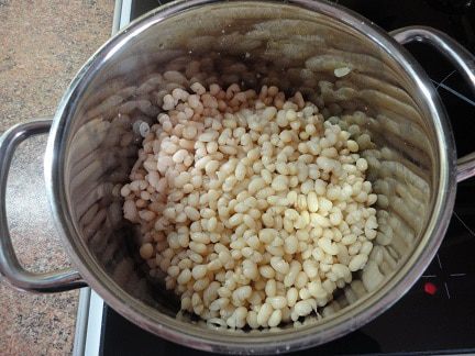 На фасоль высыпать пряности и соль, но не перемешивать. Можно сюда же выдавить зубчик чеснока.