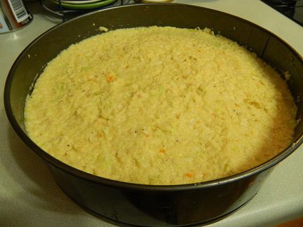 1-слой: Капусту измельчить блендером, добавить яйца и муку, посолить, тщательно перемешать. Выложить на дно разъёмной формы 1/3 массы. Этой массы должно хватить на три раза.