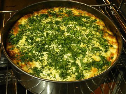 Когда наш тортик подрумянится, смазать смесью из сметаны, майонеза, и крупно натёртого сыра, и оставить дальше запекаться ещё на 10 мин.