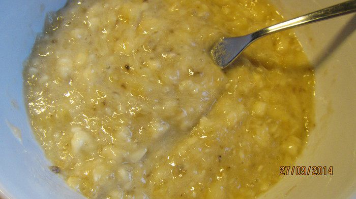 Сливочное масло растапливаем. Бананы разминаем вилкой в пюре.