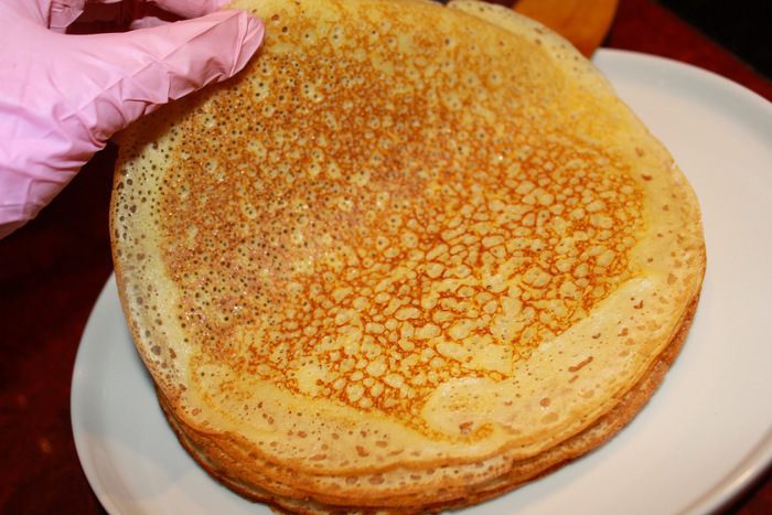 При снятии со сковороды в финале блин такой не эластичный, но если складывать блин на блин, нижний блин размягчается и становится очень податливым.