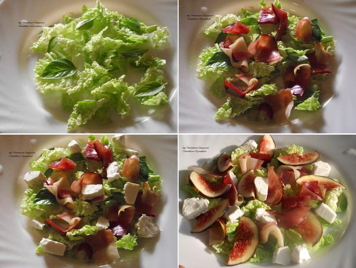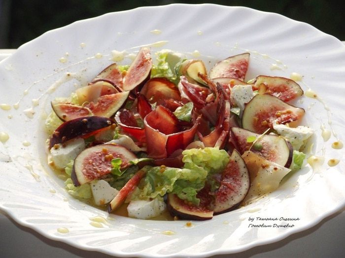 Ингредиенты для такого салата можно дополнять, например — разнообразить малиной, голубым сыром, орехами, семенами кунжута, виноградом, мятой… Главное, чтобы основным ингредиентом оставался инжир, а все остальные дополняли «настроение» салата.