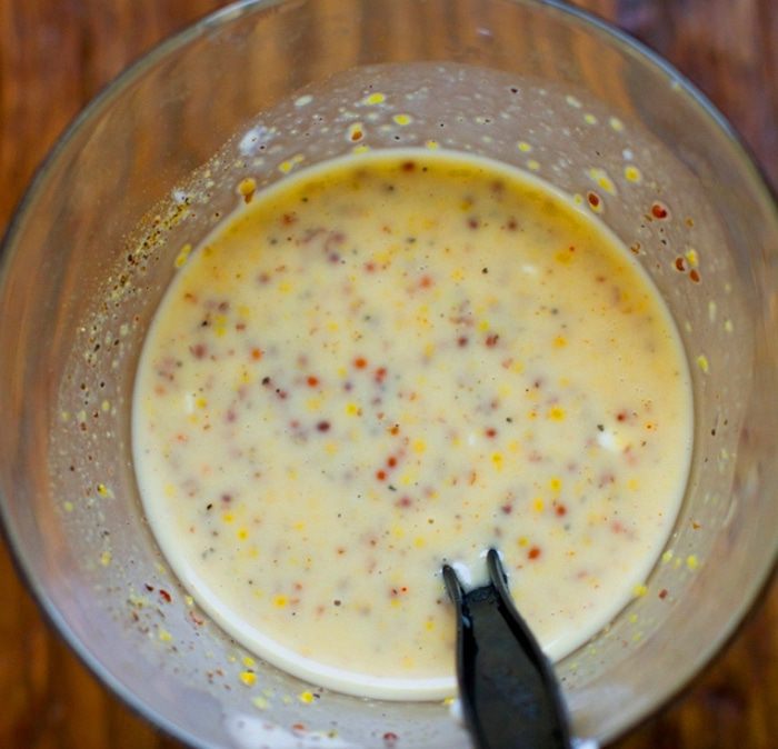 Для заправки смешиваем оливковое масло, мед, лимонный сок, горчицу, соль, перец и перед подачей поливаем сверху салат.