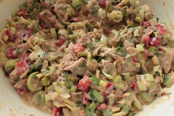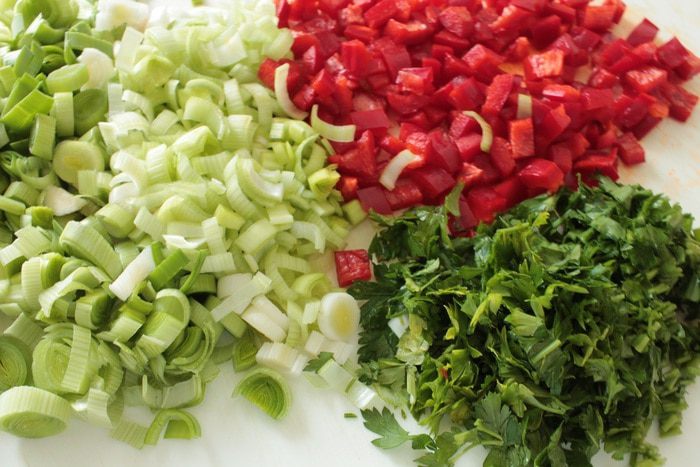 Болгарский перец нарезать мелким кубиком,зелень петрушки нарезать мелко.Лук-порей нарезать кольцами.Обжарить его на растительном масле в течении 2-3 минут,он должен слегка обмякнуть,остудить.