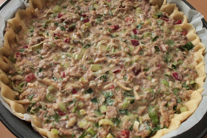 Тесто раскатать на бумаге для выпечки, перенести в форму для запекания, оформить бортик. Форма 22 см.Равномерно распределить начинку.