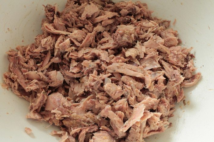 Консервированный в собственном соку тунец с помощью вилки разобрать на небольшие кусочки.Если в баночке есть жидкость,слить ее,мне попался практически без жидкости.Потребовалось две баночки весом по 175 грамм.
