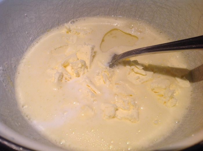 Добавьте молоко, сливочное масло (комнатной температуры) и растительное масло. Хорошо размешайте.