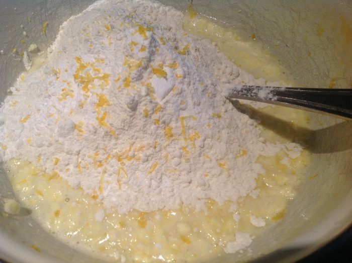 Добавьте муку, разрыхлитель и цедру лимона, и хорошо размешайте.