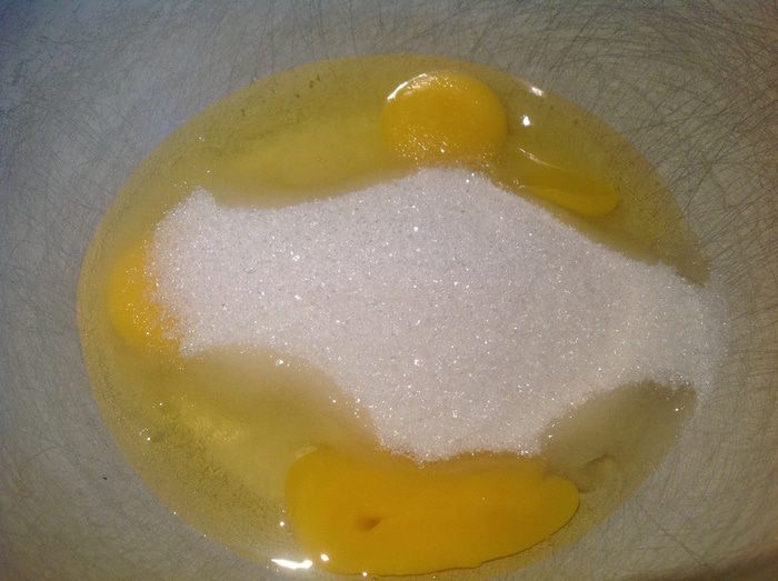Духовку разогрейте до 180 градусов. Яйца взбейте с сахаром и ванилином.