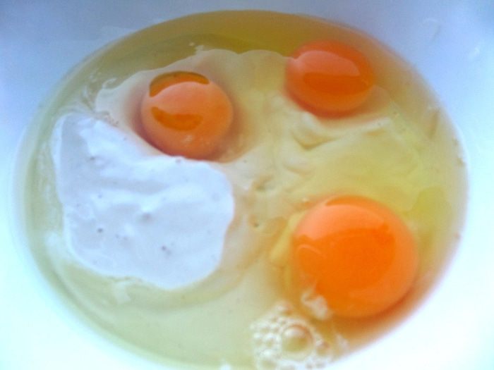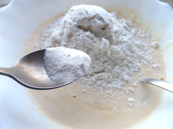 Муку с разрыхлителем,соль,если преобладает сметана. Перемешиваем массу.