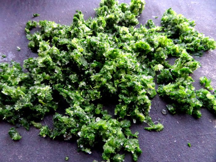 И прямо не совсем размороженный посыпаем на верхний слой теста.