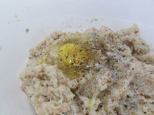 Пропустить филе рыбы (у меня хек), лук и вымоченный в молоке батон через мясорубку. Добавить яйцо, соль, перец и всё хорошо перемешать до однородности.