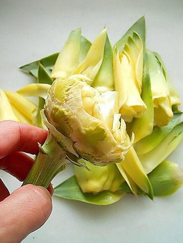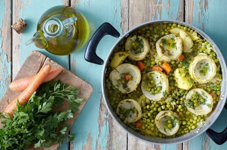 В кастрюльку наливаем оливкового масла, добавляем горох (у меня был замороженный), лук и артишоки и пассируем в течение 5 минут. Затем добавляем остальные ингредиенты (кроме петрушки), заливаем кипящей водой с соком половины лимона (так, чтобы жидкость покрывала овощи). Варить на медленном огне с крышкой пока овощи не станут мягкими (приблизительно в течение 45 минут).