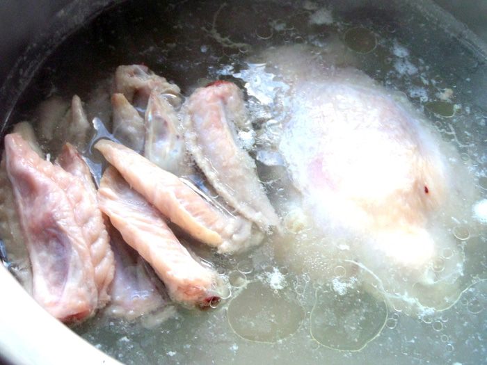 Заливаем водой спинку и крылышки,доводим до кипения,снимаем пену и лишний жир. Солим по вкусу.
