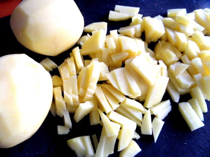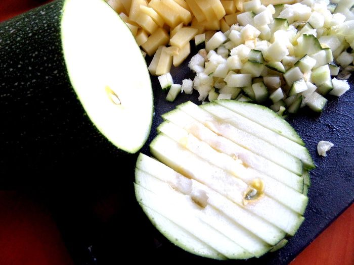Молодой кабачок прямо с кожицей делим на мелкие кубики. 5 кружков!