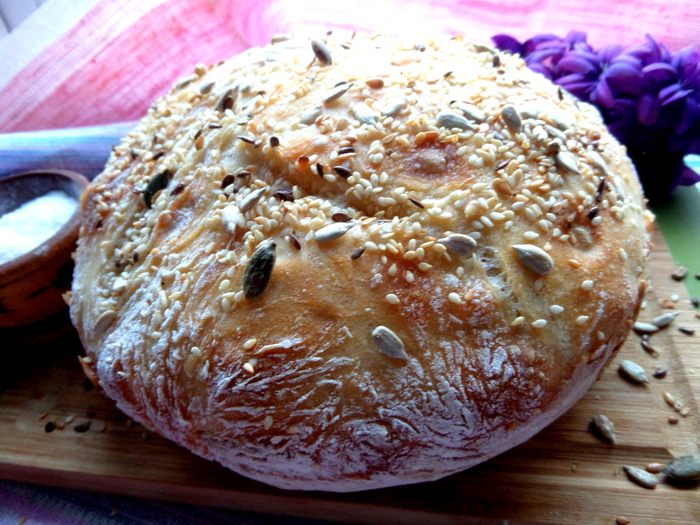 Вот такой каравай у меня вышел))) Рецепт здесь: http://www.edimdoma.ru/retsepty/64765-hleb-bez-vymeshivaniya-ot-minimalista-marka-bittmana