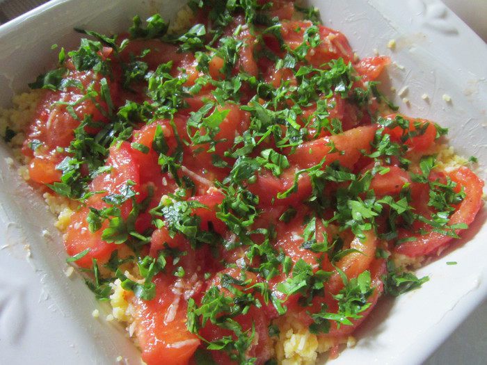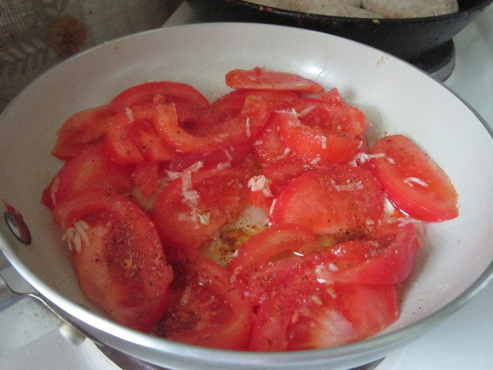 Помидоры ошпарить кипятком, окунуть в холодную воду и очистить от шкурки, нарезать дольками. В сковороде разогреть масло, зубчик чеснока очистить, натереть на мелкой терке, обжарить. Добавить дольки томатов, перемешать, накрыть крышкой, огонь отключить, дать помидорам пропитаться чесночным маслом.