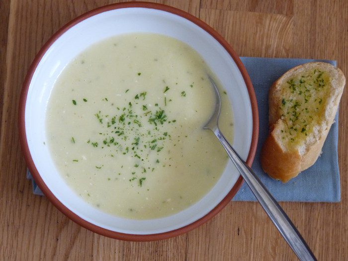 Добавить овощной бульон и варить 20 минут или пока картофель не станет мягким.