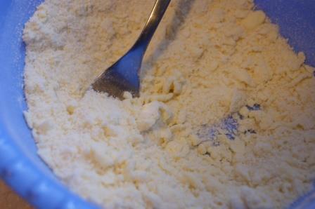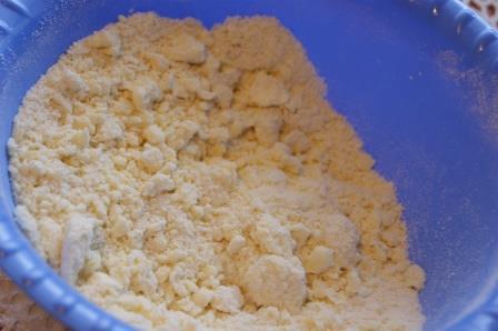 Масло нарезать на кусочки, соединить с сахаром, цедрой лимона, мукой, миндальной мукой и разрыхлителем. Смешать в крошку.