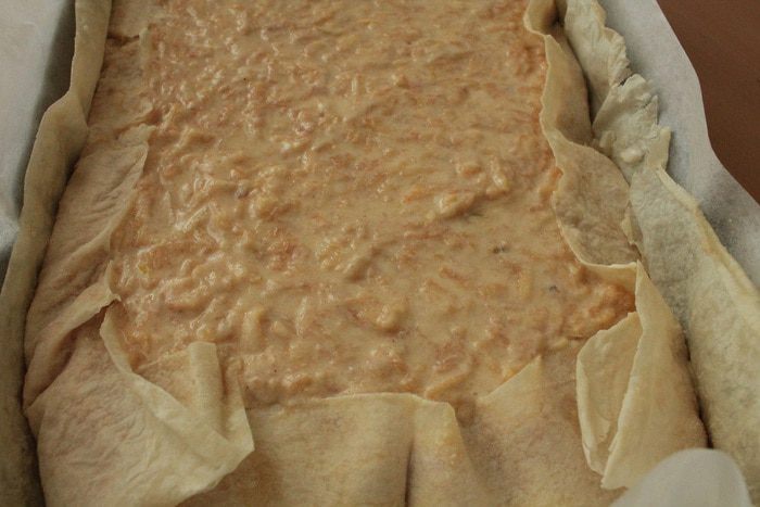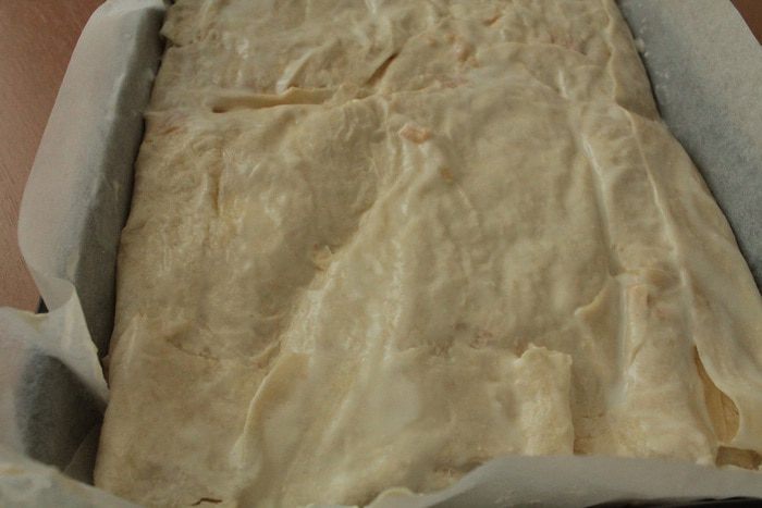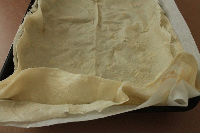 Форму для запекания выстелить пергаментом(у меня антипригарный).Выкладываем лист лаваша,обильно смазываем его сметаной,выкладываем еще один лист лаваша,слегка придавливаем руками.Лаваш надо выбирать самый тонкий.Мне попалась упаковка с бракованными листами,края толстые,а серединка слегка порванная,так что выбирайте качественный.Для смазывания лаваша понадобится дополнительное количество сметаны,примерно 80-100 гр,для этого можно использовать сметану с самой низкой жирностью,она нужна для того,что бы лаваш не был сухим после выпечки и у пирога была красивая румяная корочка.