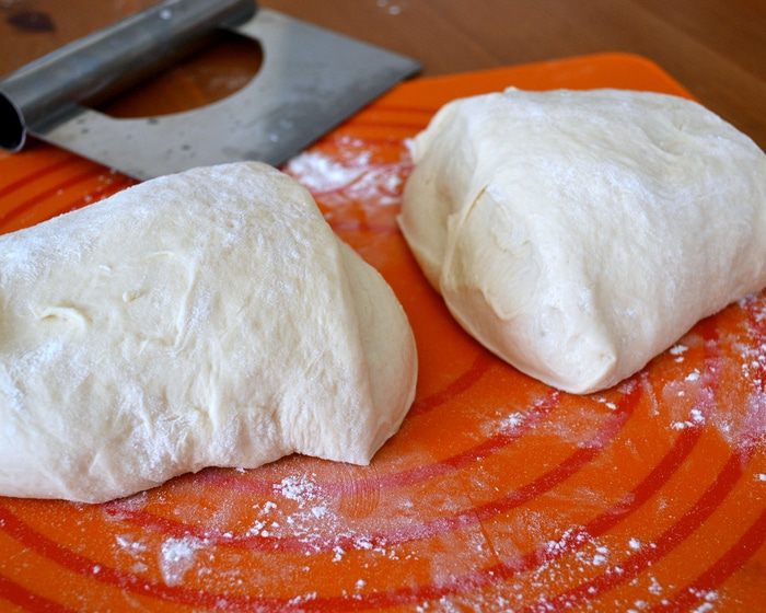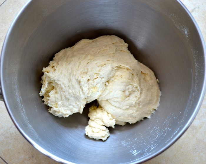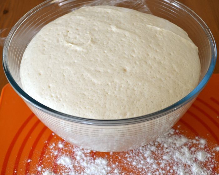 Переложить тесто в большую миску, слегка присыпанную мукой, и оставить на подъем до увеличения объема раза в три - примерно на 1 час.