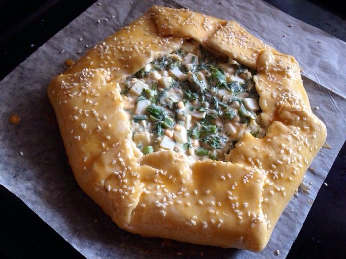 Вареные яйца (4 шт.) порезать кубиками, смешать с нарезанным зеленым луком, зеленью, тертым сыром (любой твердый) и крем-сыром (у меня этот: http://www.edimdoma.ru/retsepty/57445-krem-syr-v-domashnih-usloviyah).
