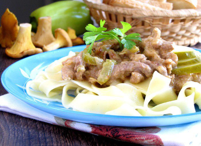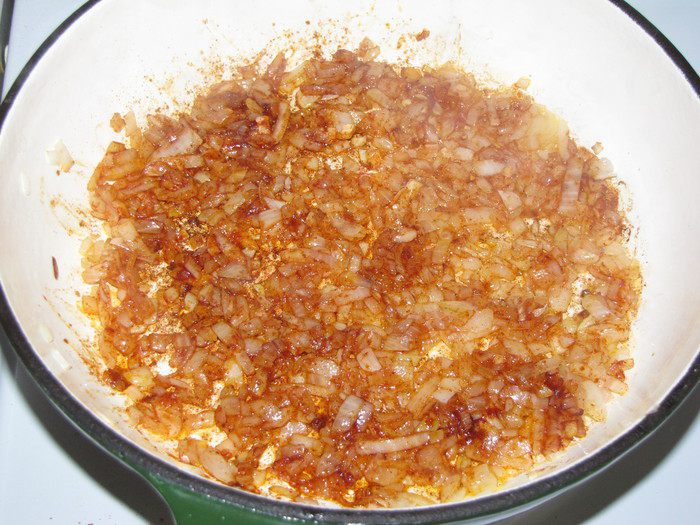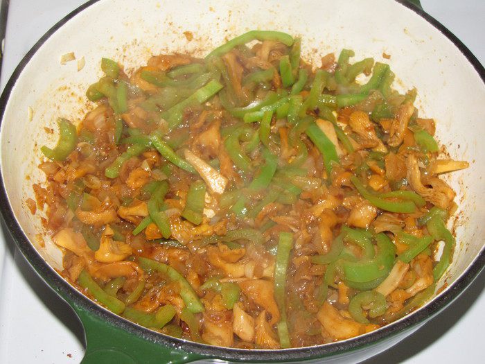 Очистить и мелко нарезать лук и чеснок. Перец нарезать полосками или квадратами. Грибы нарезать ломтиками. Разогреть в другой сковороде оставшееся оливковое масло и жарить лук до мягкости,5-7 минут. Добавить чеснок и паприку и, помешивая, готовить 1 минуту.